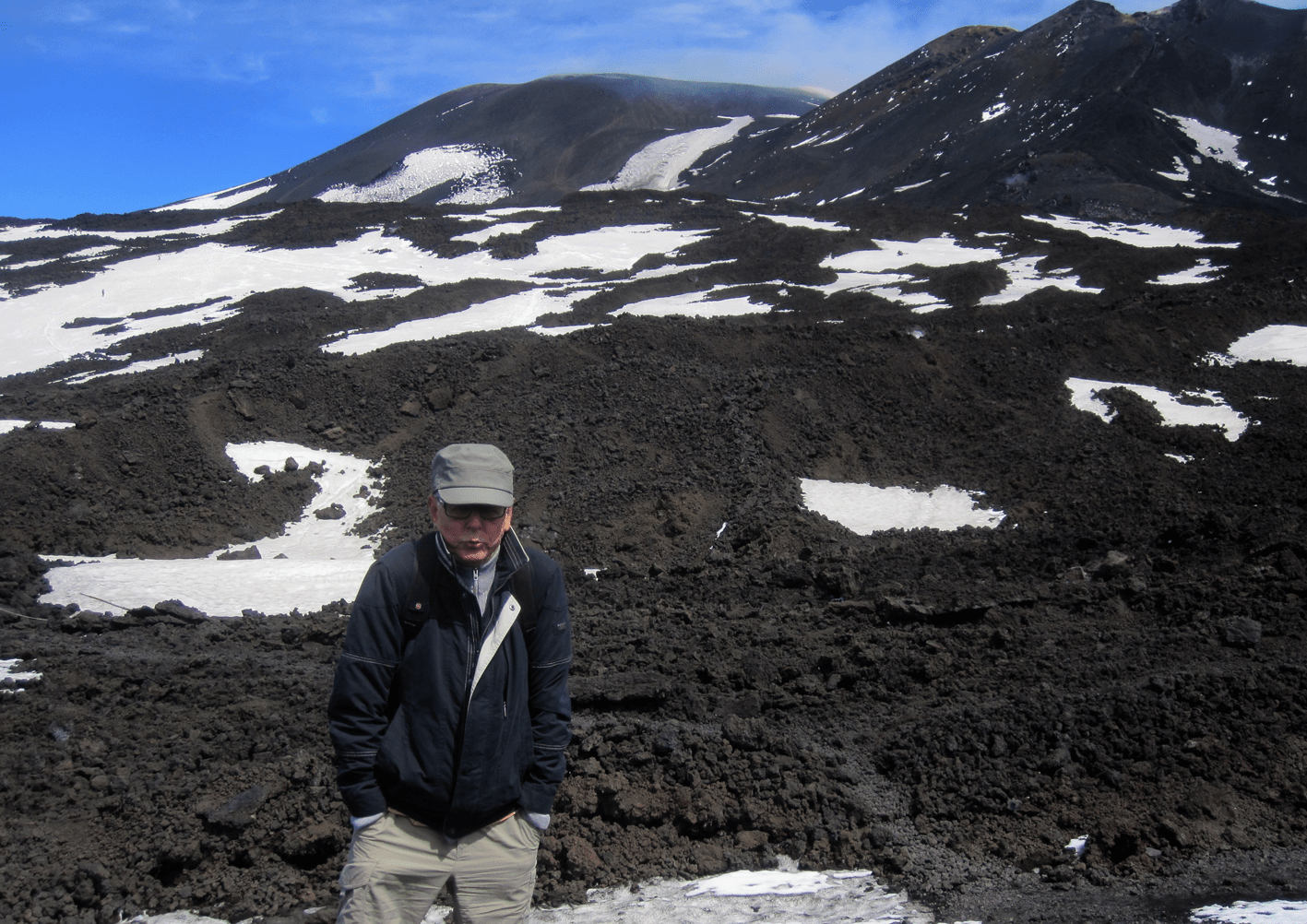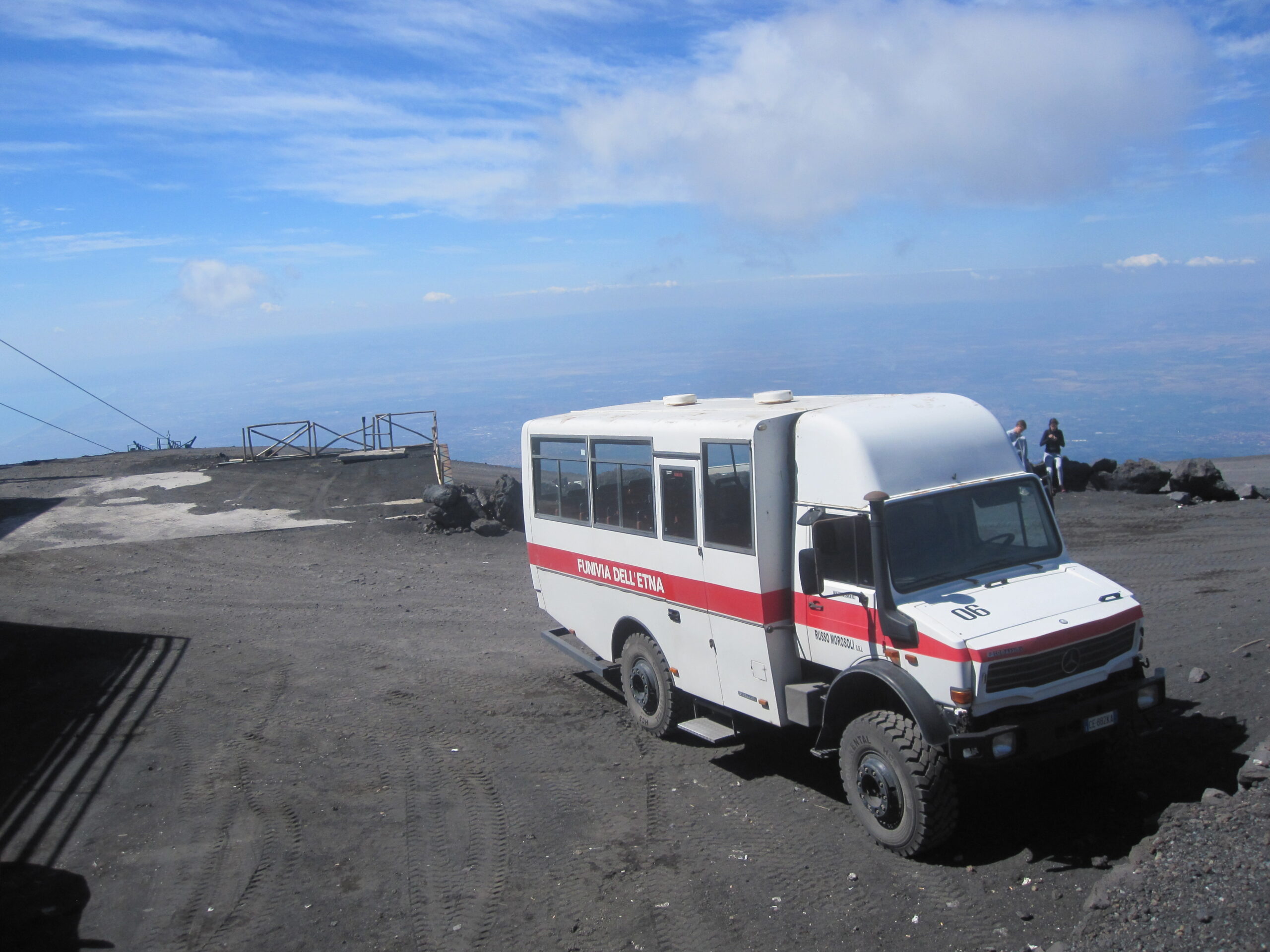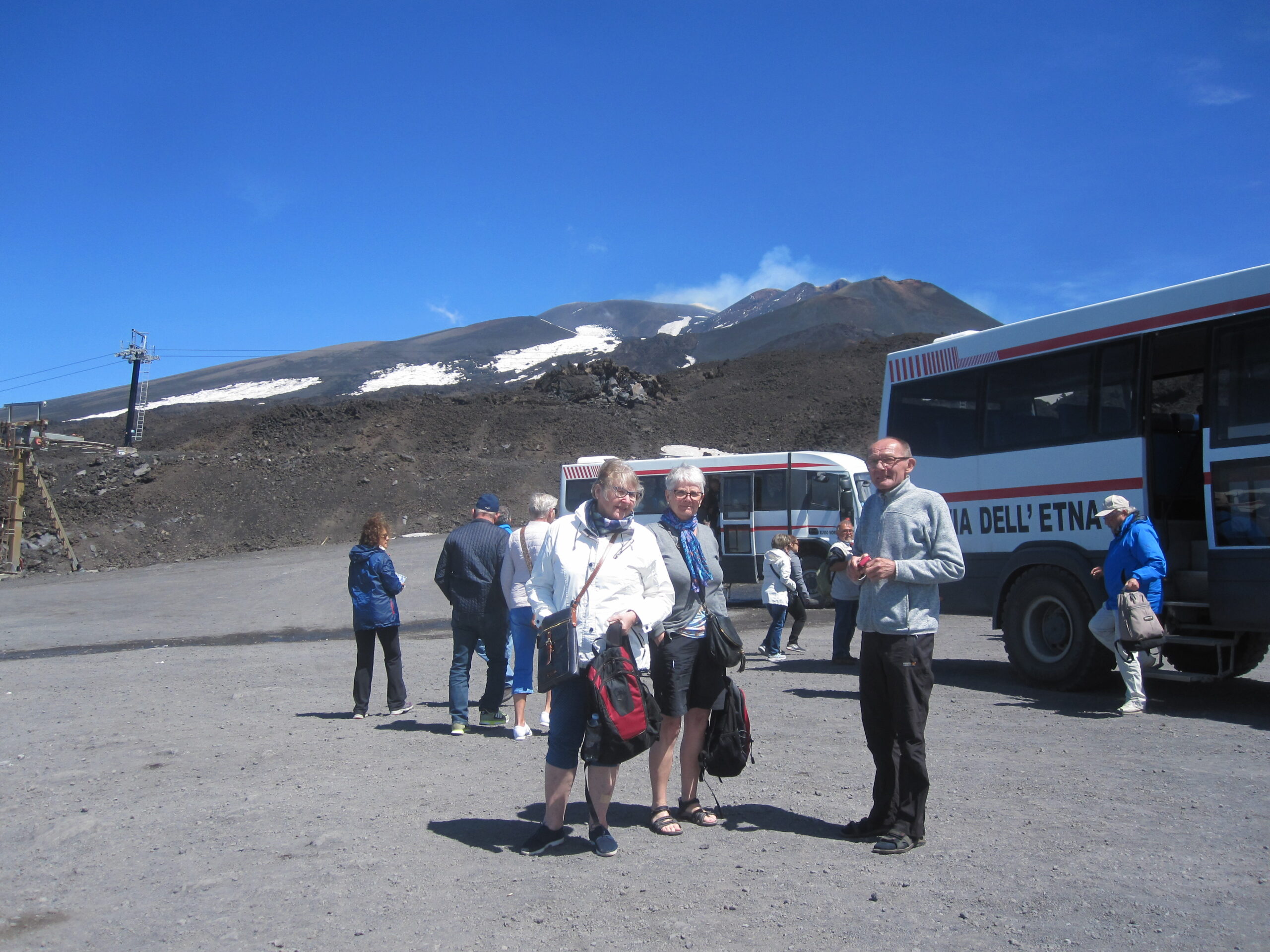 Næsten på toppen af Etna, her er goldt og koldt. Det ryger fra vulkanens kant, der er gang i den, men ikke så meget at vi ikke kunne tage op med først en svævebane, derefter små busser.