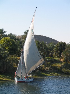 Ægypten deles i nord og syd (nedre og øvre Ægypten). Det deles i øst og vest. Øst hvor solen står op og vest hvor den går ned. Henholdsvis de levendes land og de dødes land. Alt dette på grund af Nilen. Du tror det er løgn at du ofte ser 200 meter bred med palmer og derefter sandørken. Men det er ikke løgn - sådan er det: frodigt - goldt. Kontrasterne er voldsomme. Nilen er også en færdselsåre. Utallige er de felukkaer der samler svage vinde ind i deres enorme sejl og utallige som græshopper er de nilbåde der fragter turisterne frem og tilbage mellem Aswan og Luxor. | |||