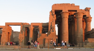 Man står tidligt op når templerne skal besøges. Eller også kommer man sent. Mange af dem åbner kl. 6 om morgenen. Har lukket fra kl. 12 til 16 og igen åbent til kl. 18 eller 19. Det har selvfølgelig noget med varmen at gøre, men måske også noget med Nilbådenes normale færden. Krokodilleguden, Sobek, har sit eget tempel. Det besøgte vi en eftermiddag hvor lyset var rødligt, lå lavt og gav nogle fantastiske scenerier. I Alexandria opbevarer de tre mumificerede krokodiller som skulle stamme fra templet. | |